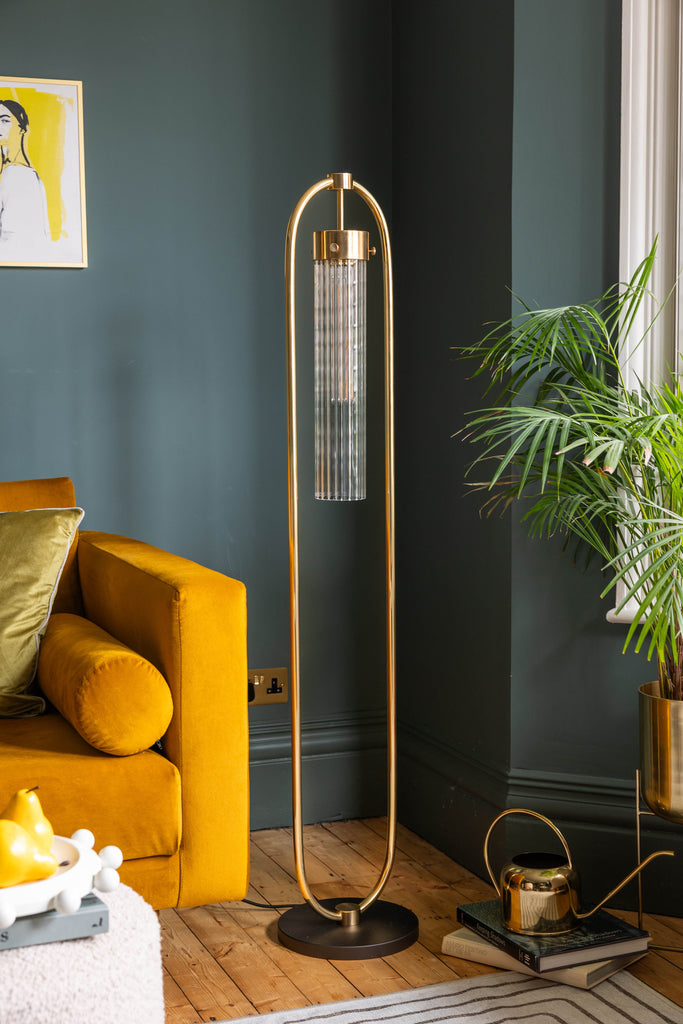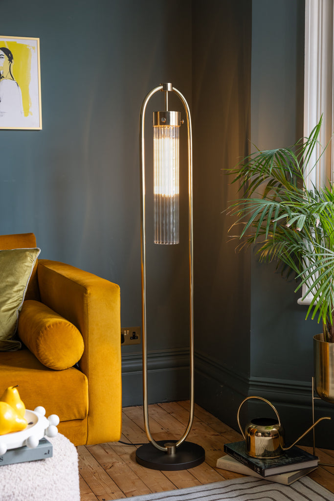With its polished brass finish and clear reeded glass shade, the ARUNDO floor lamp exudes luxury and vintage glamour.